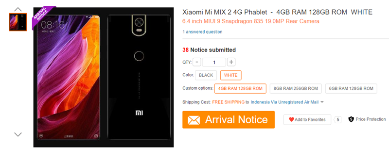 Ketika konsumen menekan tombol Arrival Notice, maka mereka akan mendapatkan pemberitahuan kapan Mi Mix 2 akan tersedia untuk dipesan. Tak hanya itu saja, berdasarkan penelusuran Tim Telset.id, situs ecommerce itu pun menyediakan daftar spesifikasi lengkap dari Mi Mix 2.