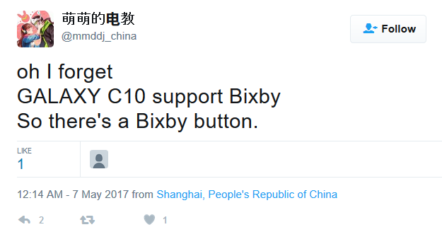 Selain Snapdragon 660, Galaxy C10 juga dikabarkan akan menyertakan tombol Bixby khusus, seperti yang terdapat pada Samsung Galaxy S8 dan Samsung Galaxy S8+.