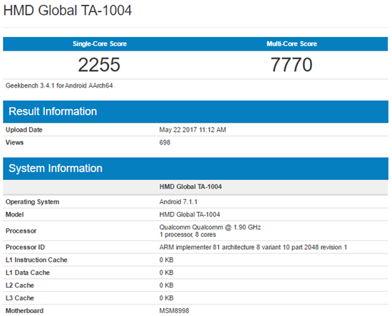 Terlihat pada situs tersebut, Nokia 9 diberi nama “HMD Global TA-1004”. Smartphone ini menurut Geekbench ditenagai oleh prosesor Octa-core 1.9GHz dengan chipset dari Qualcomm dengan jenis yang masih dirahasiakan. Namun jika melihat dari bocoran-bocoran sebelumnya, kemungkinan besar Nokia 9 menggunakan Snapdragon 835.