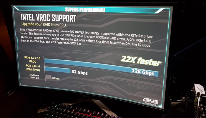 Asus juga memperkenalkan fitur baru lainnya yang hadir bersama Intel X Series terbaru, seperti VROC, Virtual RAID on CPU, yang memungkinkan RAID SSD Intel PCIe, sehingga bisa menawarkan performa yang sangat tinggi. VROC ini memungkinkan RAID 0, 1, dan 5, tetapi membutuhkan key khusus untuk mode RAID di luar RAID 0. Oleh sebab itu, di motherboard X299 ASUS terdapat header khusus untuk VROC.