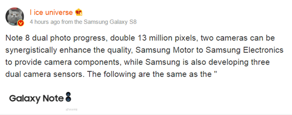 Tak hanya itu, jika menurut rumor sebelumnya Galaxy Note 8 akan membawa kamera ganda dengan masing-masing beresolusi 12MP + 13MP, menurut akun bernama @ice tersebut, Galaxy Note 8 akan membawa dual-camera dengan resolusi 13MP.