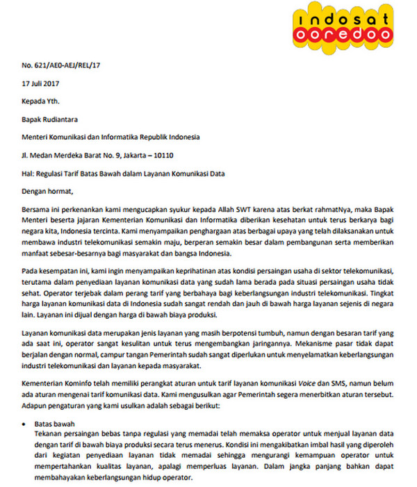 Dalam salinan surat yang diterima Telko.id, Kamis (20/7/2017), surat itu mengungkapkan keprihatinan Indosat atas kondisi persaingan usaha di sektor telekomunikasi, terutama dalam penyediaan layanan komunikasi data yang diklaim pada situasi persaingan usaha tidak sehat.