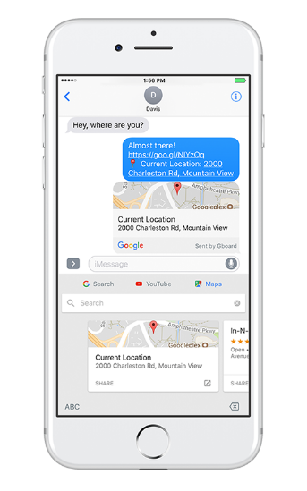 Kemudian fitur selanjutnya adalah hadirnya Google Maps di Gboard. Dengan adanya fitur ini, pengguna iOS tak lagi harus menyalin atau mengetikkan alamat secara manual ke teman chatting, melainkan hanya harus menekan tombol G dan ketikkan alamat yang akan dicari seperti biasa, kemudian kirimkan langsung ke teman Anda.