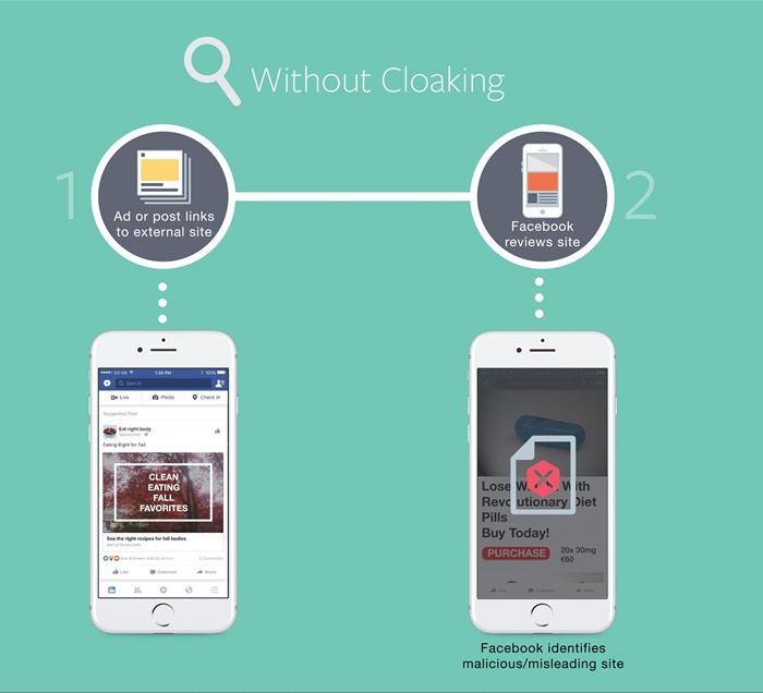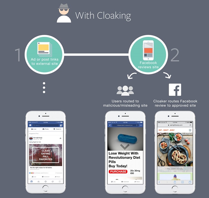 Menurut Facebook, teknik yang diberinama “Cloaking” tersebut sengaja dibuat oleh orang-orang yang tak bertanggung jawab untuk menghindari proses Facebook Review. Rata-rata, teknik cloaking dilakukan untuk mempromosikan pil diet, pornografi, dan juga suplemen otot palsu.