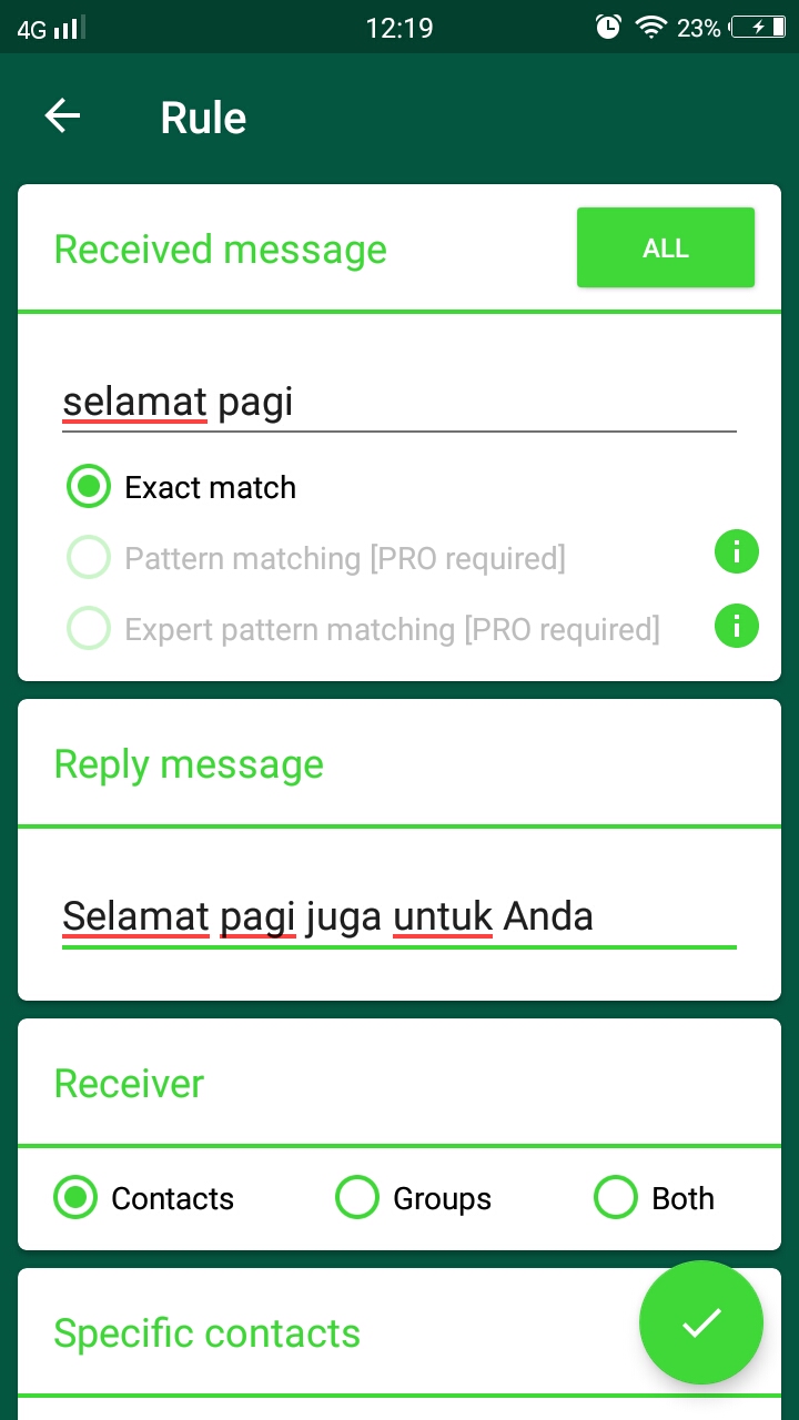Selanjutnya, Anda tinggal masukkan kalimat apa yang akan menjadi balasannya. Kali ini kami mencontohkannya dengan memasukkan kalimat ‘Selamat pagi juga untuk Anda’. Setelah selesai, klik tanda check list di bagian bawah kanan aplikasi.