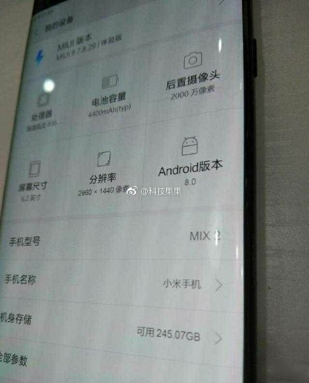 Terlihat pada foto, Xiaomi Mi Mix 2 akan dipersenjatai dengan adanya prosesor dengan chipset Snapdragon 836, baterai berkapasitas 4,400 mAh dan sudah berjalan di atas Android 8.0 Oreo.
