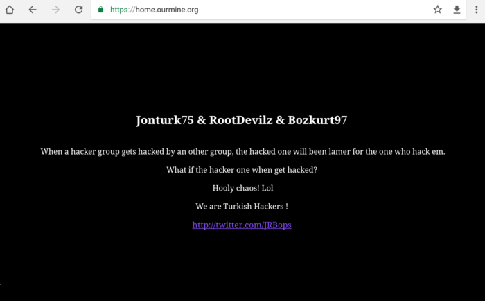 Uniknya, kelompok hacker OurMine akhirnya harus terkenal “karma”, karena tengah malam tadi telah diretas oleh kelompok hacker lainnya. Informasi tersebut didapat dari akun Twitter The Hacker News yang mengunggah foto halaman utama website OurMine yang telah di-deface oleh sekelompok hacker yag mengaku berasal dari wilayah Turki.