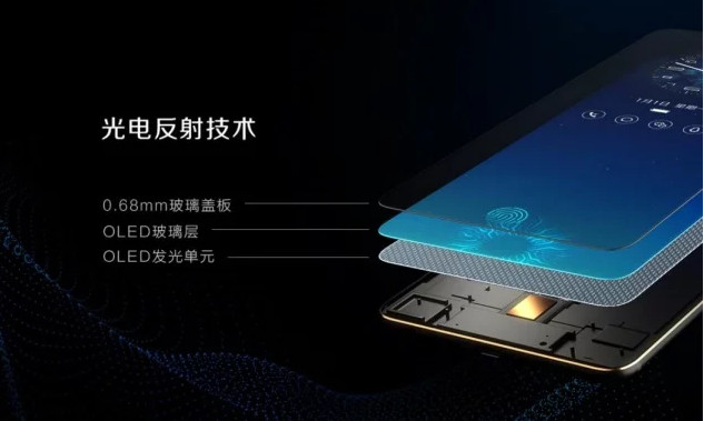 Untuk sensor sidik jari terletak antara kaca depan dan panel display yang dibuat oleh Synaptics . Menurut Vivo, dengan menggunakan teknologi refleksi fotolistrik, RGB Pixel yang secara khusus disesuaikan dengan panel OLED memancarkan cahaya yang menembus kaca luar yang memiliki ketebalan 0,68mm hingga mencapai jari. Perusahaan mengklaim bahwa sensor sidik jari di bawah layar dapat membuka kunci telepon sekitar 0,6-0,7 detik.