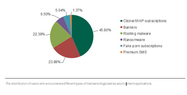 Setelah itu diikuti oleh malware rooting dan ransomware. Bahkan ransomware sering hadir dalam bentuk aplikasi yang sah untuk situs porno dikenal.