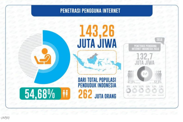 Demikian diumumkan Asosiasi Penyelenggara Jasa Internet Indonesia (APJII) setelah melakukan survei penetrasi dan perilaku pengguna internet di Indonesia, Senin (19/02/2018), di Jakarta.