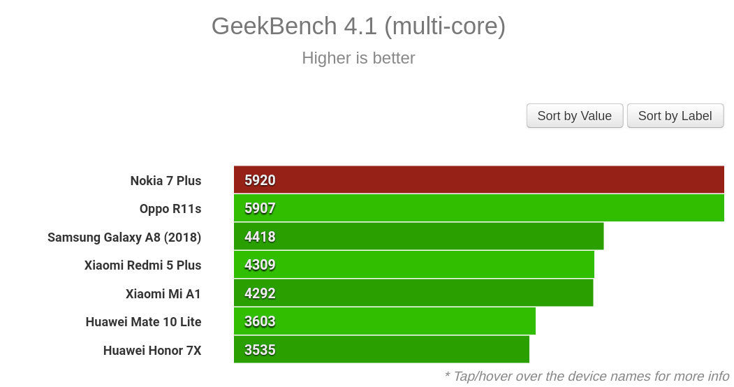 Pada tes menggunakan Geekbench misalnya, Nokia 7 Plus berhasil meraih skor 1.641 poin untuk single-core dan 5.920 poin untuk multi-core. Meninggalkan jauh smartphone mid-end premium dari Samsung yakni A8 (2018) dengan masing-masing skor 1.532 dan 4.418 poin.
