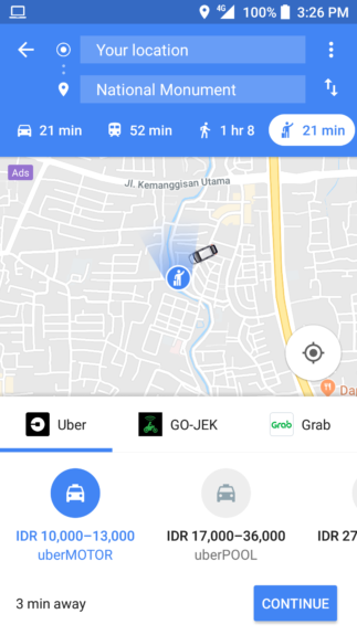 - Jika sudah menentukan layanan yang ingin digunakan, tekan tombol Continue untuk lanjutkan pesanan khusus untuk layanan Uber atau Open App khusus untuk Go-jek dan Grab.