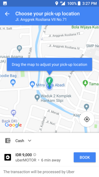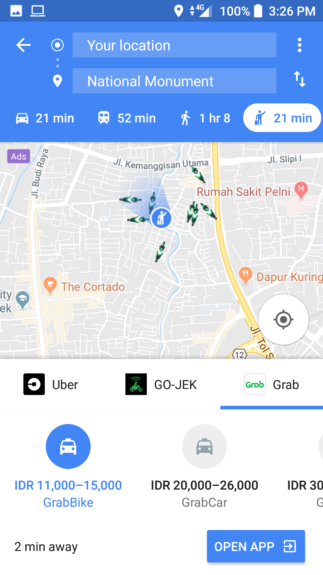 - Terdapat tiga layanan ride sharing yang bisa digunakan yakni Uber, Go-jek dan juga Grab. Tepat di bagian bawahnya, Anda bisa memilih layanan yang ingin digunakan beserta estimasi harganya.