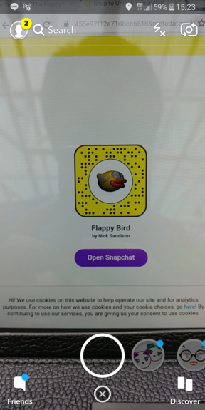 - Jika sudah, akan muncul QR Code khas Snapchat pada situs tersebut. Sekarang, buka aplikasi Snapchat dan pindai QR Code itu dengan memotretnya atau menekan tombol lingkaran di tengah layar.