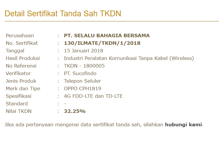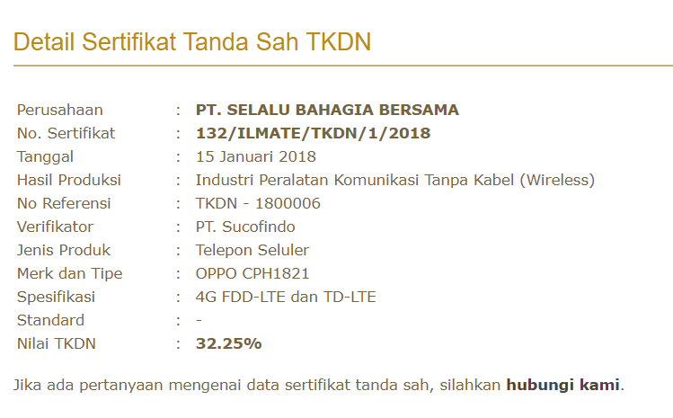 Pada situs tersebut, terlihat adanya dua perangkat dengan kode Oppo CPH1821 dan CPH1819 dengan nilai TKDN sebesar 32,25% yang mendapatkan sertifikasinya sejak 15 Januari 2018 lalu.
