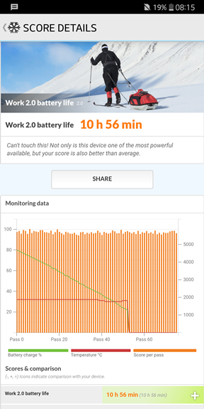 Kita bahas sektor baterainya terlebih dahulu. Untuk melihat kemampuannya, kami menggunakan resolusi layar tertinggi dan menggunakan fitur Always-on Display. Berdasarkan benchmark menggunakan aplikasi PCMark, baterai LG V30+ hanya mampu bertahan selama 10 jam 56 menit dengan baterai tersisa 19%.