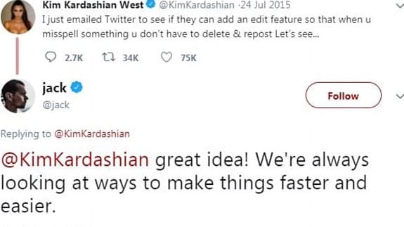 Dilansir News.com, permintaan Kardashian yang diunggah ke Twitter pun mendapat respons dari Jack Dorsey. Ia menyebut apa yang disampaikan oleh Kardashian merupakan usulan yang sangat brilian.