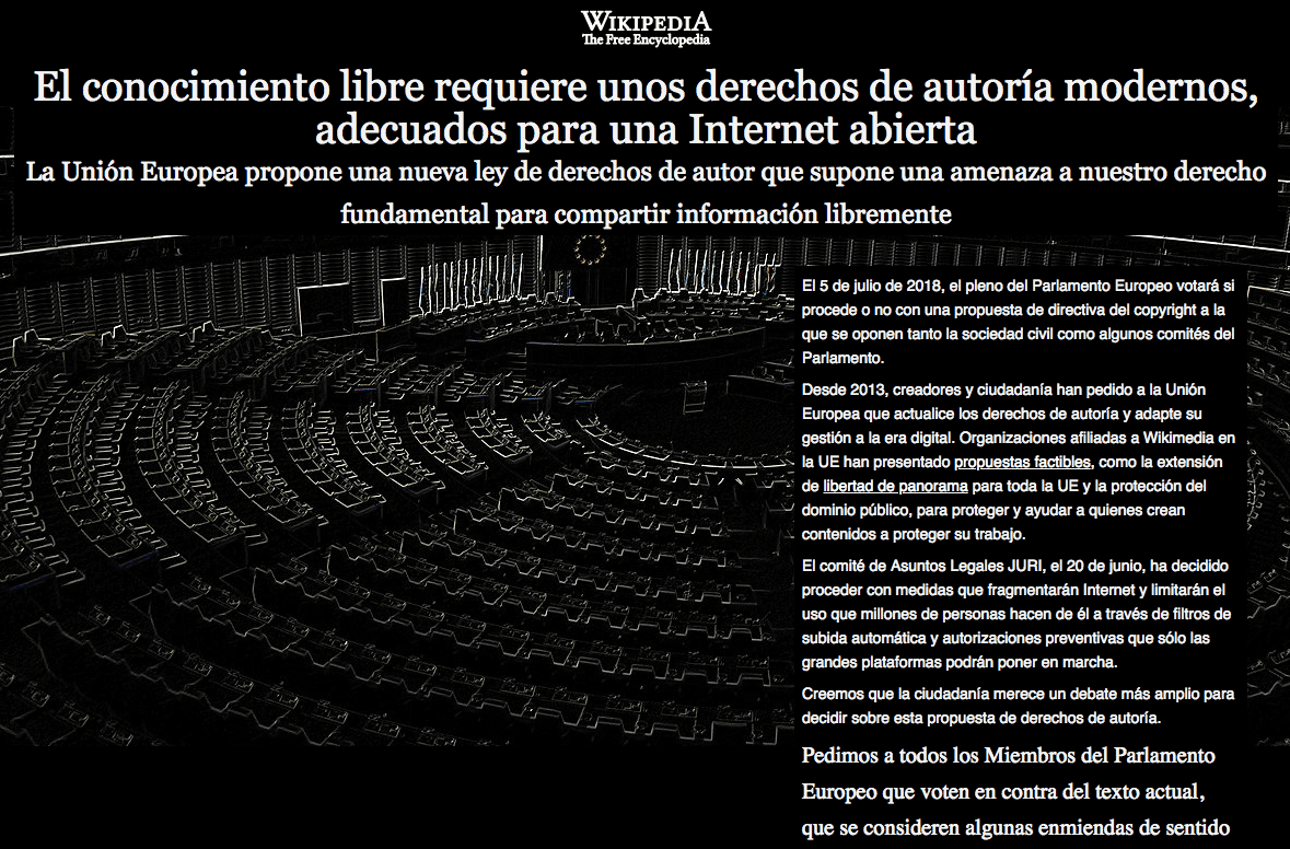 Perubahan tampilan Wikipedia Spanyol dan Italia menjadi serba hitam terjadi menjelang pemungutan suara Parlemen Eropa terkait Undang-undang Hak Cipta UE yang kontroversial.