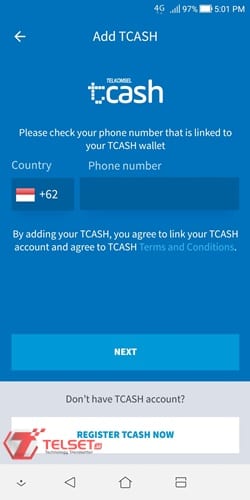 • Otomatis, Anda diharuskan untuk memasukkan nomor telepon yang terdaftar dengan layanan TCash dan tekan tombol Next.