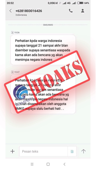 Konten hoaks selanjutnya datang dari pesan berantai melalui Short Message Service (SMS). Beredar SMS dari nomor +6281803016426 yang menyampaikan agar warga Indonesia berjaga-jaga mulai tanggal 21 sampai akhir bulan Desember 2018 karena akan terjadi bencana.