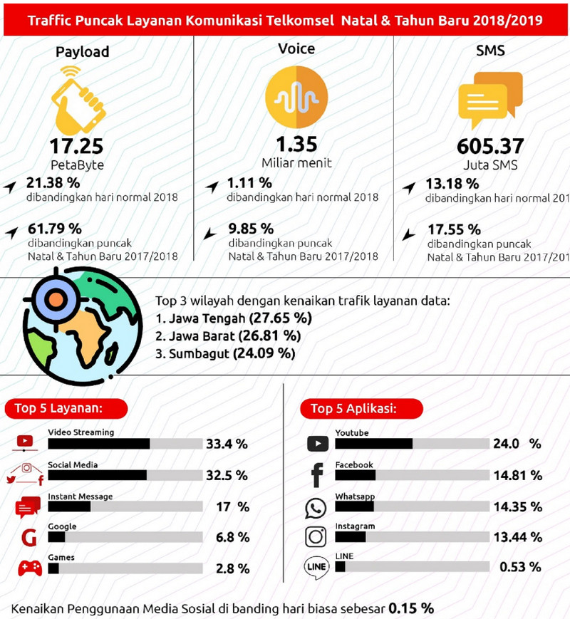 Sementara jika dibandingkan dengan periode Tahun Baru 2017/2018, trafik layanan data kali ini melonjak 61,7%. Wilayah dengan kenaikan trafik layanan data tertinggi adalah Jawa Tengah dan D.I. Yogyakarta dengan peningkatan 27,6% dibandingkan hari normal, diikuti Jawa Barat (26,8%) dan Sumatera Utara (24,0%).