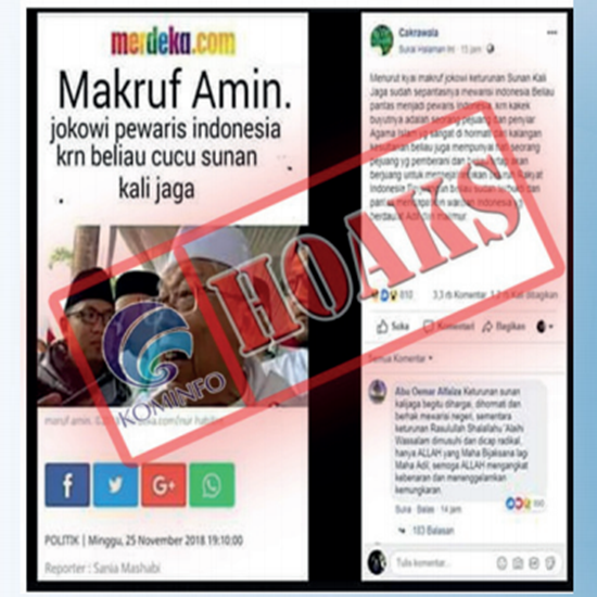 Telah beredar di media sosial Facebook dengan nama akun Cakrawala yang memposting sebuah gambar yang berisi narasi: “Menurut kyai Makruf, Jokowi keturunan Sunan Kali Jaga sudah sepantasnya mewarisi Indonesia.