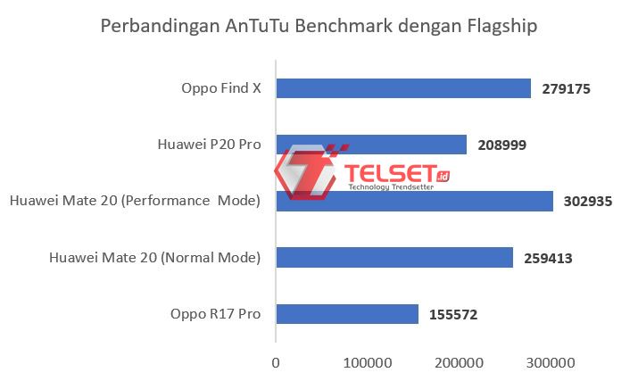Berdasarkan pengujian kami, Oppo R17 Pro mencetak skor 155 ribuan. Apabila kami bandingkan dengan smartphone di harga yang hampir sama, seperti Huawei Mate 20 yang dibanderol dengan harga Rp 8,9 jutaan, Huawei P20 Pro dengan harga Rp 9,5 jutaan, sampai Oppo Find X dengan 10,8 jutaan, Oppo R17 Pro sangat tertinggal performanya.