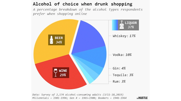 Studi memasukkan persentase 79 persen orang yang membeli barang secara online sekali saat mabuk, terhadap seluruh penenggak miras di AS. Total, ada 138 juta warga AS yang menjadi penenggak alkohol.