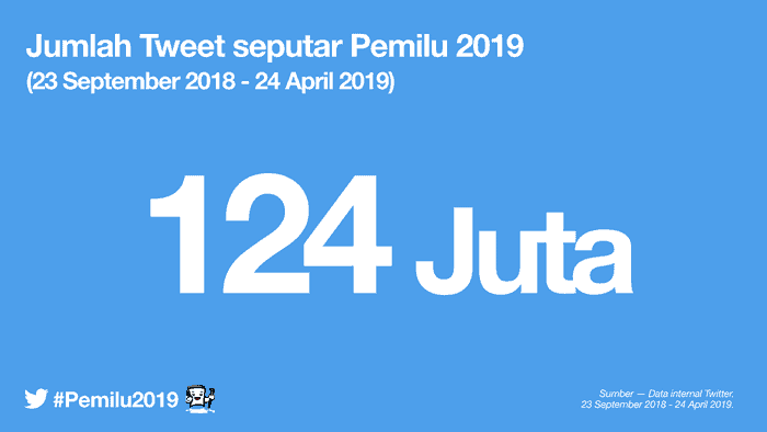 Netizen Indonesia menyambut perhelatan Pemilu 2019 dengan berbagai cuitan di lini masa. Dengan tagar #Pemilu2019, tercatat lebih dari 124 juta Tweet terkait pemilu yang dicuitkan oleh warganet.