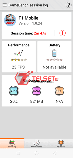 Sebab, smartphone mampu dengan stabil menjalankan F1 Mobile di rata-rata 23 fps. Terlihat dari hasil benchmark, terdapat beberapa penurunan framerate pada game yang diakibatkan oleh banyaknya objek karakter lain pada satu waktu atau lokasi.