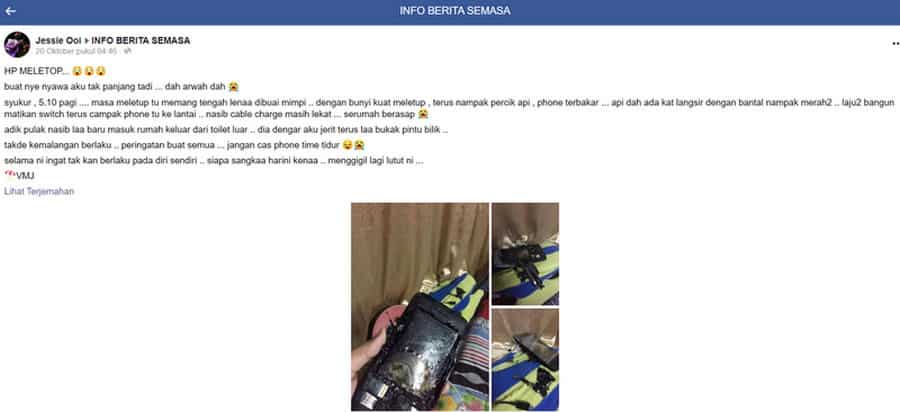 Pemilik akun Jessie Ooi ini mengatakan, kejadian ponsel meledak ini terjadi saat ia sedang tertidur pulas. Tiba-tiba, dia mendengar suara “pop” dengan keras.