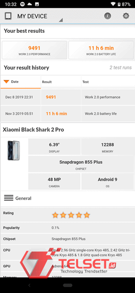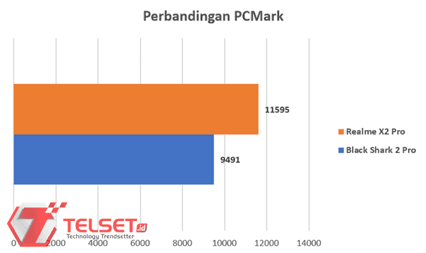 Kemudian PCMark Work 2.0 Performance. Smartphone tersebut menghasilkan skor 9.491 Poin. Apabila dibandingkan dengan smartphone bertenaga Snapdragon 855+ lainnya, seperti Realme X2 Pro, smartphone ini masih tertinggal untuk pengujian benchmark. Berikut perbandingannya:
