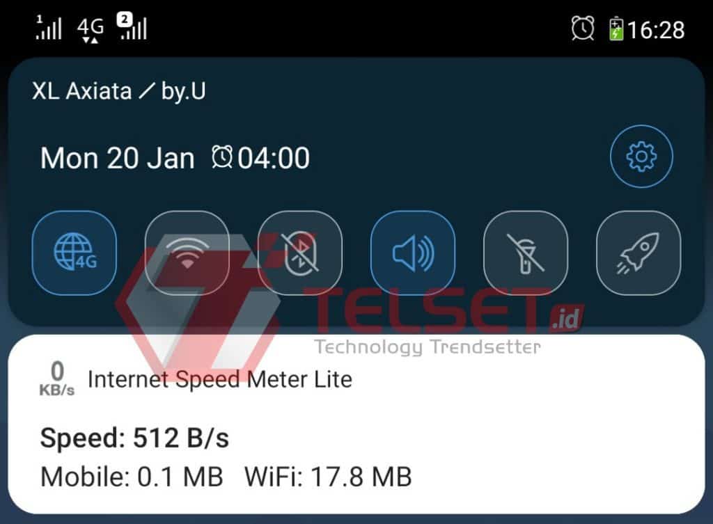 - Aplikasi juga akan langsung memunculkan indikator yang memperlihatkan kecepatan jaringan internet yang sedang digunakan. Indikator ini berada di bagian notification bar dan juga notification tray