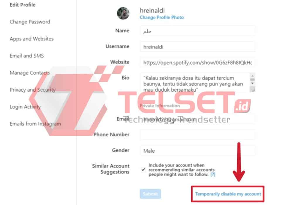 - Setelah masuk ke bagian edit profile, gulirkan ke bagian bawah hingga Anda menemukan “Temporarily disable my account“. Klik opsi tersebut.