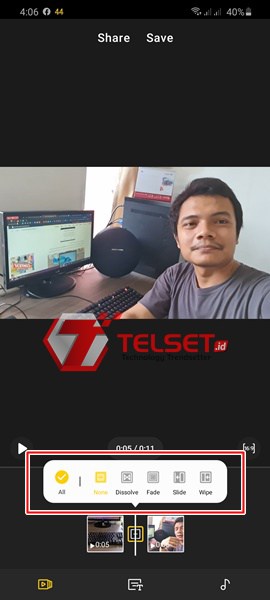 - Tentu perlu ditambahkan transisi setiap video. Caranya, ketika menambahkan footage video untuk diedit, terdapat ikon < – > di antara footage. Tekan tombol tersebut, dan kamu akan disuguhi lima tipe transisi video berbeda.