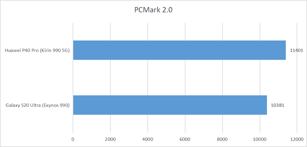 Sedangkan pada PCMark 2.0, Huawei P40 Pro akhirnya berhasil mengungguli kemampuan dari Galaxy S20 Ultra. Yang artinya dalam pemakaian sehari-hari seperti rowsing, edit foto dan video, texting dan lain-lain, P40 Pro memiliki performa yang lebih baik dari Galaxy S20 Ultra.