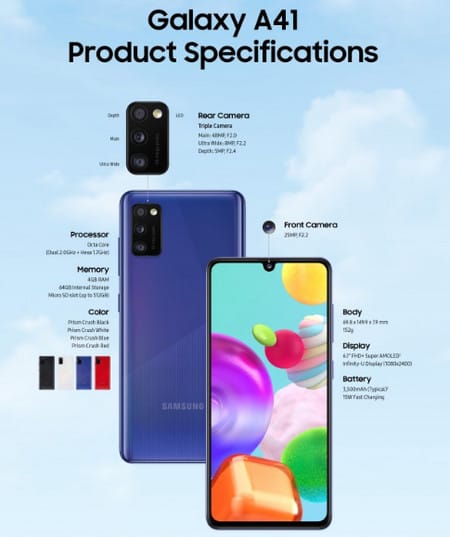 Diperkenalkan di Negeri Kincir Angin, Galaxy A41 hadir dengan tiga varian warna yang bisa dipilih konsumen. Seperti Prism Crush Black, Prism Crush White, dan Prism Crush Blue.