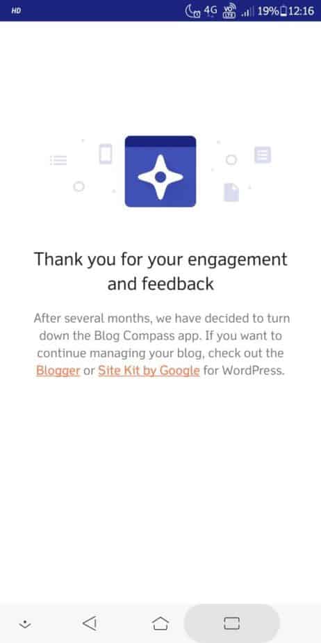 Sementara Blog Compass masih tersedia di Play Store, membukanya sekarang hanya menampilkan pesan selamat tinggal.