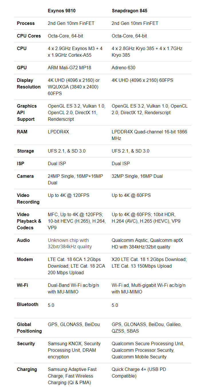 Exynos 9810 dan Snapdragon 845 keduanya dibangun pada proses LPP 10nm LPFET generasi kedua dari Samsung. Keduanya juga memiliki CPU 8 inti, modem Gigabit LTE, dual-ISP, Bluetooth 5.0 dan dukungan untuk layar 4K. Selain meningkatkan efisiensi aplikasi AR dan VR, chip baru ini juga menjanjikan peningkatan pembelajaran mesin dan kemampuan kecerdasan buatan.