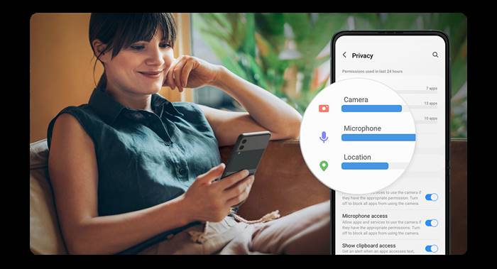 Pengguna Samsung dapat memonitor dan mengontrol pengaturan privasi menjadi lebih mudah, mulai dari memberikan peringatan hingga saat aplikasi mencoba mengakses kamera atau mikrofon.