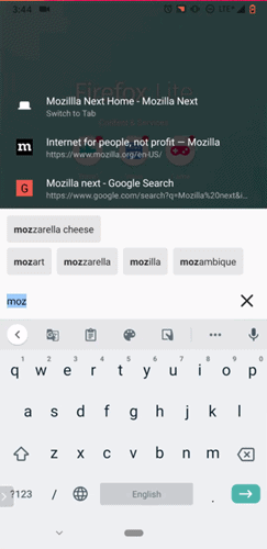 Ketika pengguna mencari sebuah kata kunci di kolom pencarian di Firefox Lite, hasil pencarian khusus akan muncul sesuai dengan riwayat pencarian pengguna, bookmark, dan tab, memberikan hasil yang lebih baik dari pencarian biasa.