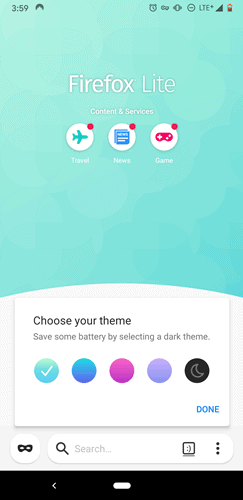 Dengan fitur baru Firefox Lite, pengguna dapat dengan mudah menyesuaikan Konten dan Layanan (Games, News, Travel), menyematkan situs web favorit, dan mengubah tema atau warna latar belakang untuk layar utama sesuai dengan preferensi warna mereka.