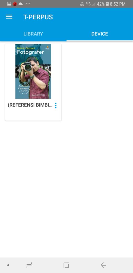 Bisa dilihat pada gambar, pada T-PERPUS memiliki interface yang sangat mudah. Halaman awal terdapat Library yang berfungsi sebagai rak atau kumpulan buku-buku dengan jumlah lebih dari 3000 buku. Lalu ada Device dimana ini tempat untuk buku yang sudah di download.