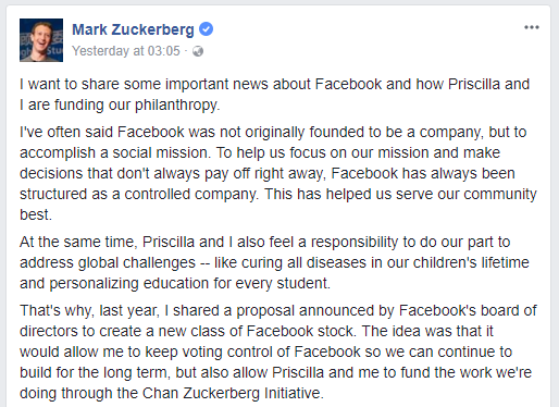 “Kami punya banyak hal yang harus dikerjakan di Chan Zuckerberg Initiavite, bersama ilmuwan, pendidik, dan dokter di seluruh dunia yang butuh dukungan hari ini, bukan berdekade-dekade mendatang,” ujar Zuck.