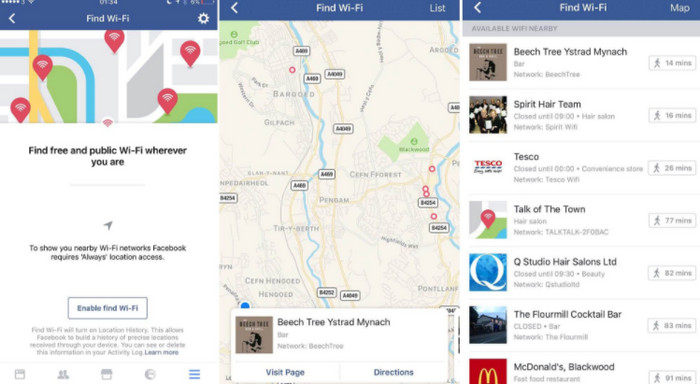 Setelah mengaktifkan fitur Find Wi-Fi, para penggunanya otomatis akan melihat daftar tempat seperti restoran, mall, dan lainnya yang memiliki koneksi Wi-Fi plus tampilan peta yang memperlihatkan titik-titik dari lokasi tersebut.