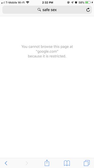 Hal yang sama juga terjadi terkait topik pornografi. Parental Control iOS 12 belum dapat memblokir kata-kata terkait pornografi secara spesifik. Misalnya saja ketika mencari “bagaimana cara bermasturbasi”, yang informasinya biasanya tidak jauh dengan pornografi.