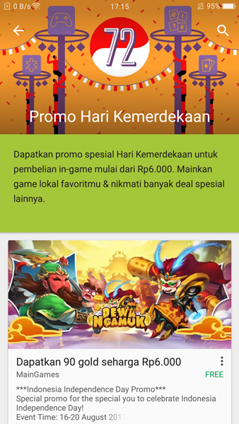 Program bernama “Promo Hari Kemerdekaan” tersebut memberikan diskon untuk in-app purchase atau pembelian di dalam aplikasi untuk lima game buatan developer lokal terpilih seperti Dewa Ngawur, Nasi Goreng, Enneas Saga, Juragan Ojek, dan juga Mini Racing Adventures.