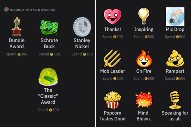 Pengguna dalam grup bisa membeli penghargaan secara individual dengan Reddit Coins. Pembelian menggunakan uang asli. Setiap penghargaan dihargai 300 koin sampai 40.000 koin atau setara USD 100 atau sekitar Rp 1,4 juta.