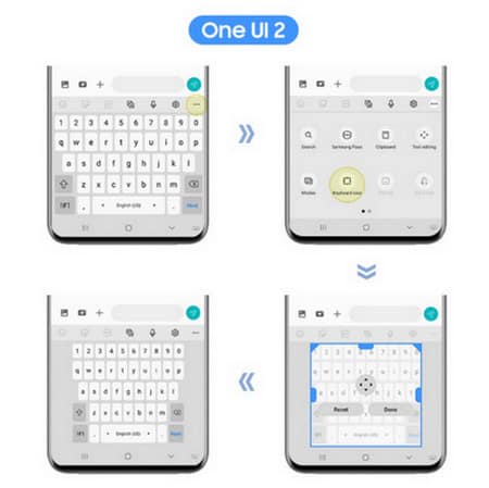 Penempatan ikon disesuaikan di One UI 2 sehingga sebagian besar tugas dapat diselesaikan di area bawah layar. Selain itu, untuk tindakan yang memerlukan interaksi di bagian atas layar, gerakan jari yang tidak perlu diminimalisir untuk meningkatkan kenyamanan dan kemudahan.