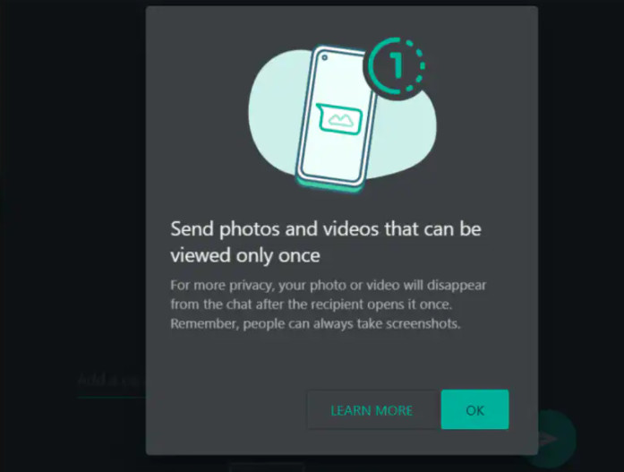 WABetaInfo telah melaporkan tentang peluncuran update WhatsApp Web versi 2.2126.11 yang memungkinkan pengguna membuat foto dan video menghilang atau terhapus otomatis dari obrolan setelah dilihat.